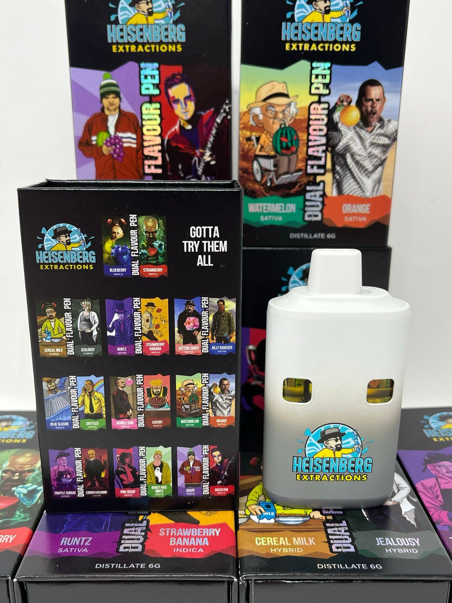 Heisenberg Extractions disposable Vape Pen contain 6 grams of THC and with there revolutionary duel chamber technology you can enjoy 2 flavours in 1 device! Simply slide the mouth piece to change flavours. Each Heisenberg Extractions disposable Vape Pen contains 6 grams of THC distillate. Their dual chamber technology delivers a smooth draw and a wave of flavours. With the Heisenberg Dual Flavour vape pen you can enjoy 2 flavours in 1 device! 3G + 3G of each flavour. Simply slide the mouth piece to vape Pen. Easily change flavours by sliding the mouth piece No VG/PG Press button 5 times and wait to turn vape on and off. Hold button and haul to vape!